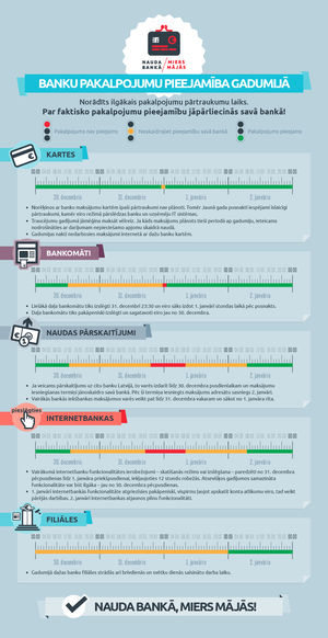 «Gada nogalē un gadu mijā īsāki dažu banku pakalpojumu darba laiki ir ierasta lieta. Tā kā Latvijā 1. janvārī mainās nacionālā valūta, šogad svētku laikā iedzīvotājiem finanšu lietas jāsaplāno laikus. Visērtāk Jauno gadu un eiro sagaidīs tie iedzīvotāji, kas skaidro naudu būs iemaksājuši savā bankas kontā un norēķiniem izmantos maksājumu kartes. Ja vajag citu bankas pakalpojumu, atsevišķi jāpārliecinās par tā pieejamību savā bankā,» saka Latvijas Komercbanku asociācijas prezidents Mārtiņš Bičevskis.