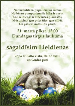 31. III plkst. 13.00 Dundagas tirgus laukumā sagaidīsim Lieldienas kopā ar Balto vistu, Raibo vistu un Gudro pūci.