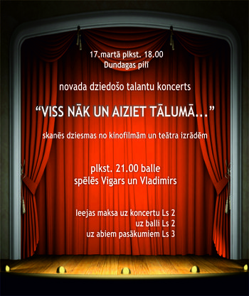 17. martā plkst. 18.00 novada dziedošo talantu koncerts «VISS NĀK UN AIZIET TĀLUMĀ…»