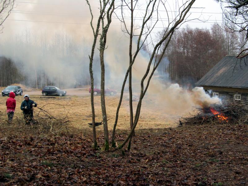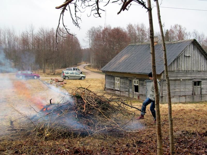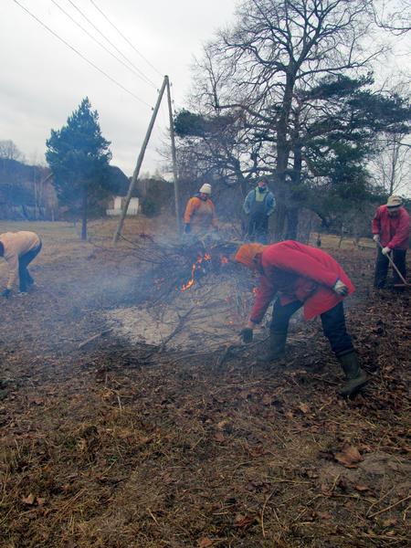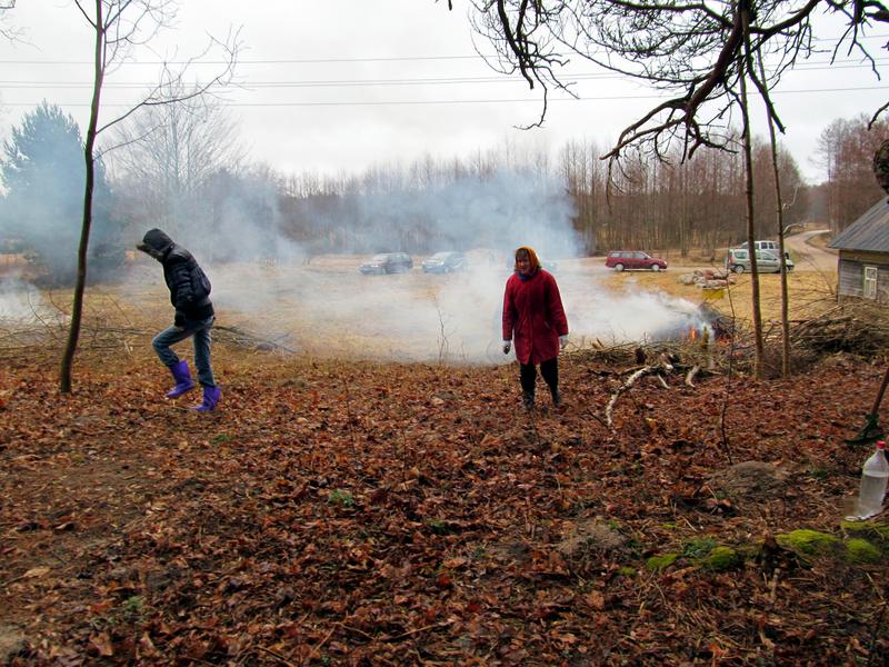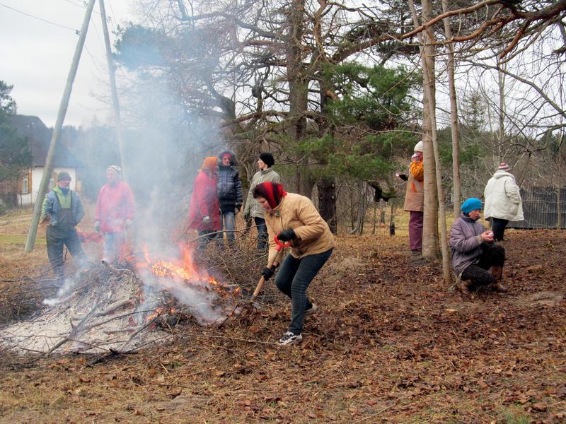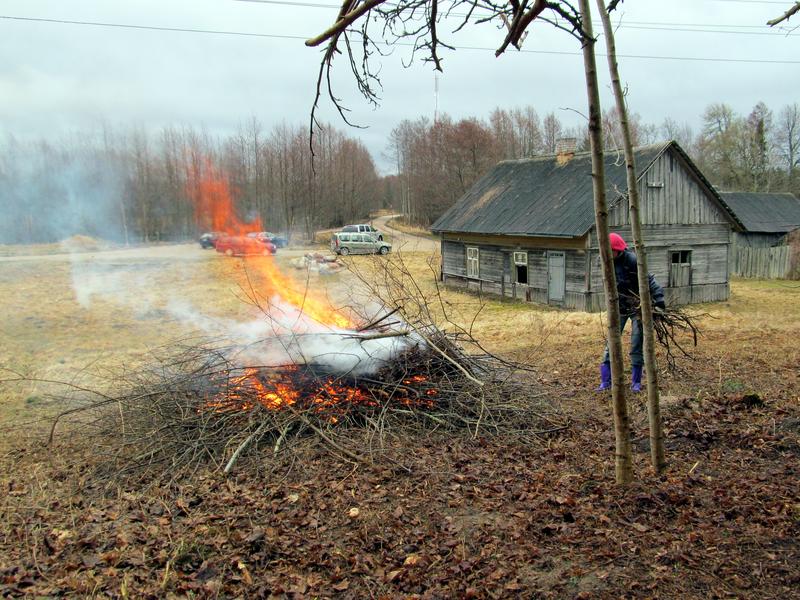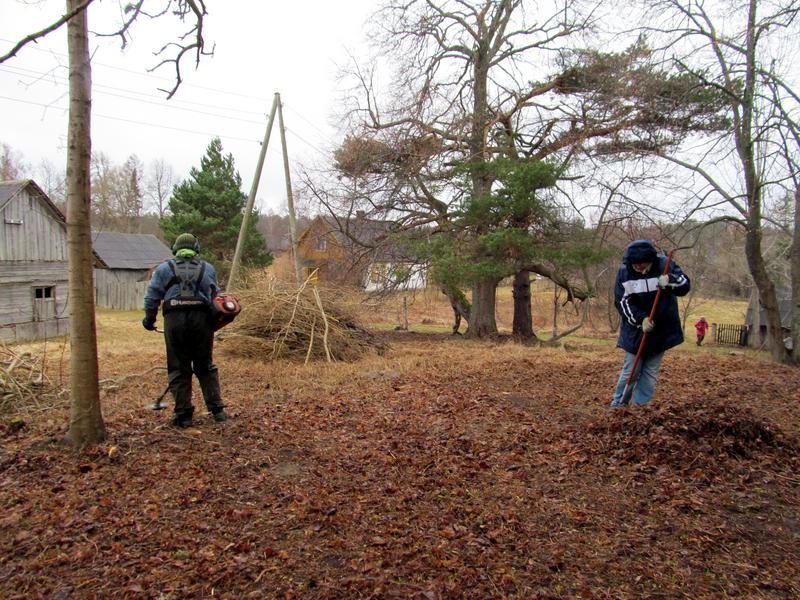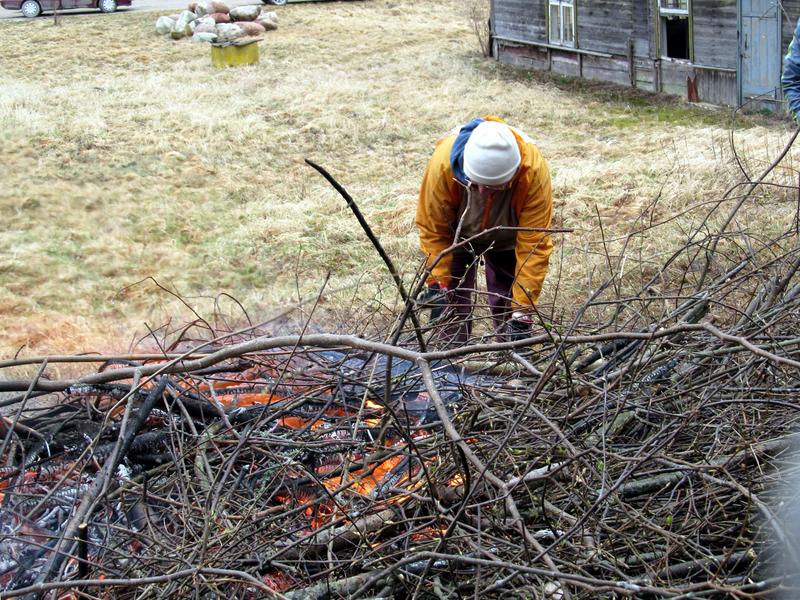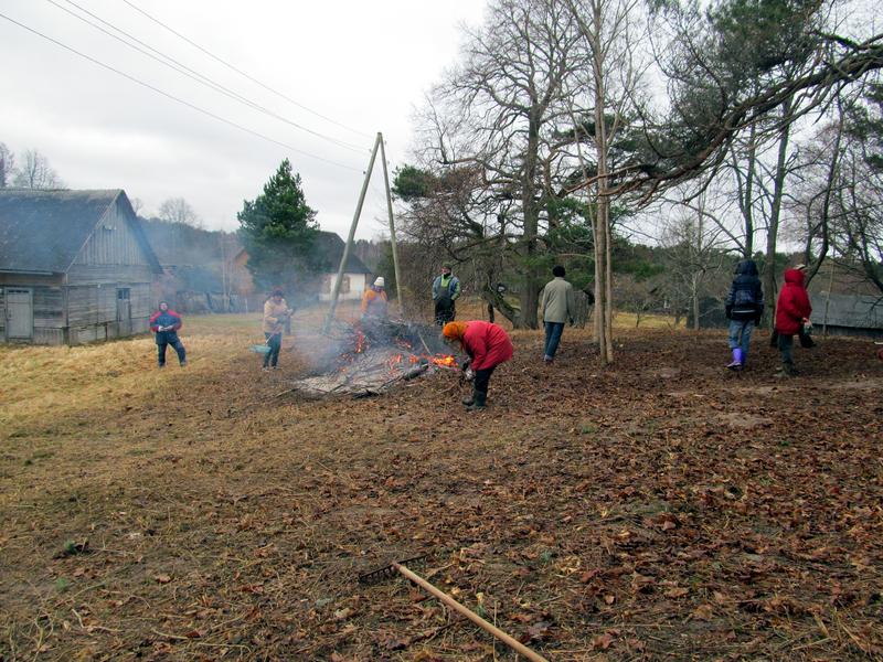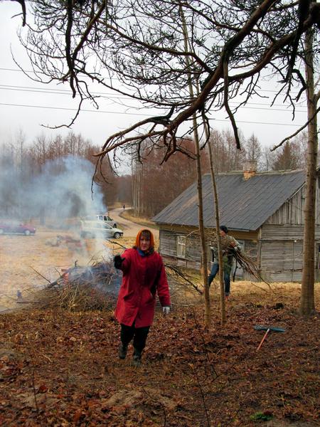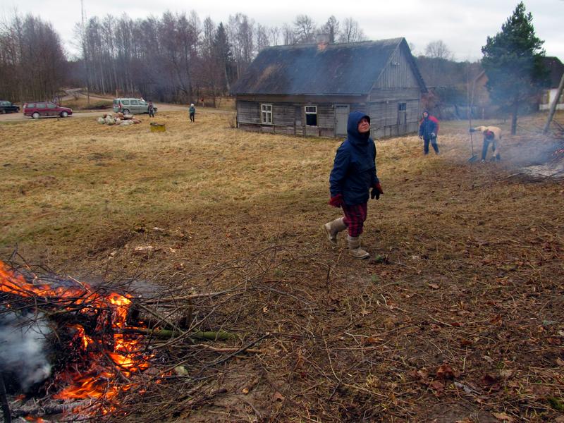 Ko paveicām? Nopļāvām pieskas, izzāģējām vecos ceriņus, sagrābām zarus un lapas, visādas krodas un ņogas, visu, ko varējām, to sadedzinājām, un šķiet, ka nekādus pārpalikumus aiz sevis neatstājām, izņemot viena talcinieka aizmirstu grābekli.