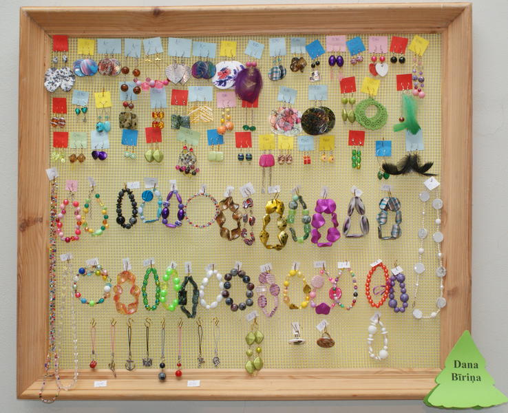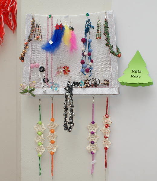 Dažnedažādas sedziņas — adītas, austas, tamborētas, rakstainas zeķes un cimdi, čībiņas zīdaiņiem, Adventa vainagi no čiekuriem, gliemežvākiem un citiem dabas materiāliem, rotaslietas, lakati, šalles, koka karotītes, tamborētas eglīšu rotas un smalki, tamborēti groziņi, māla podiņi un svečturīši, kartītes, matu dekori un pat somas — tas nebūt nav viss, kas izstādē aplūkojams un tirdziņā nopērkams. Apskatot izstādi un tirdziņu, atcerējos laikus, kad tur varēja iegādāties lina audumā ietērptas burciņas ar medu no Induļa un Zintas Ķierpju dravas. Uz šādām atmiņām mani vedināja Vitālija Nazārova sarūpētie kārumi — ķirbju un cidoniju sukādes, ko var pagaršot un tad lemt, iegādāties vai ne. Gardas jau gan!