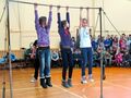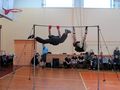 Kad puiši bija pie stieņa demonstrējuši savus trikus un saņēmuši skaļus aplausus, viņi spēkus izmēģināt aicināja arī trīs meitenes. Viņām bija nelielas sacensības izturībā — bija pēc iespējas ilgāk jākarājas pie stieņa. Visas izrādījās pietiekami izturīgas un spēcīgas. Kad Toms aicināja zēnus, saskrēja krietns pulks un vingrotājiem nācās mainīt uzdevumu, jo visiem pie stieņa nepietika vietas. Tad nu bija jāguļas, ar elkoņiem un kurpju purngaliem atspiežoties pret grīdu. Nemaz nebija viegli ilgu laiku tā noturēties.