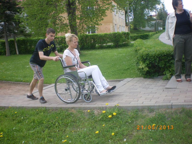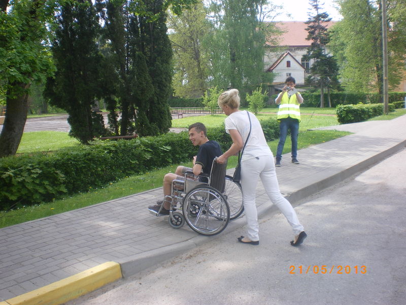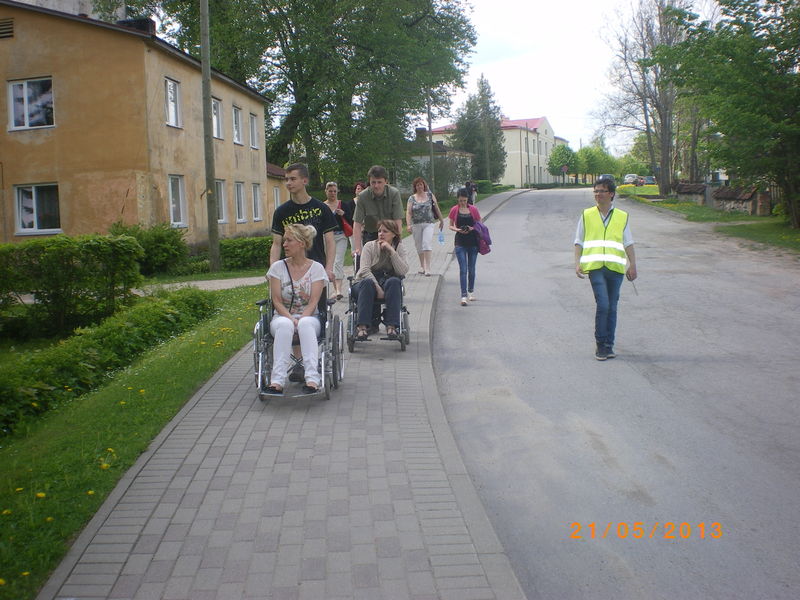 Pēc filmas devāmies aplūkot, kā ir ar vides pieejamību Dundagas centrā. Vienā no riteņkrēsliem sēdās Kultūras pasākumu organizatore Ruta Bērziņa, vajadzības gadījumā viņai palīdzēja 10. klases skolēns Matīss Grauze, bet otrā riteņkrēslā pamīšus — sociālā darbiniece Inese Bernāne un 10. klases skolēns Igors Oļeksjuks. Starp citu, abi puiši piedalījās tāpēc, ka viņi vēlas rakstīt zinātniskās pētniecības darbu par vides pieejamību Dunadgas centrā cilvēkiem ar īpašām vajadzībām. Kopā ar viņiem bija arī šī darba vadītāja Inga Leistmane.