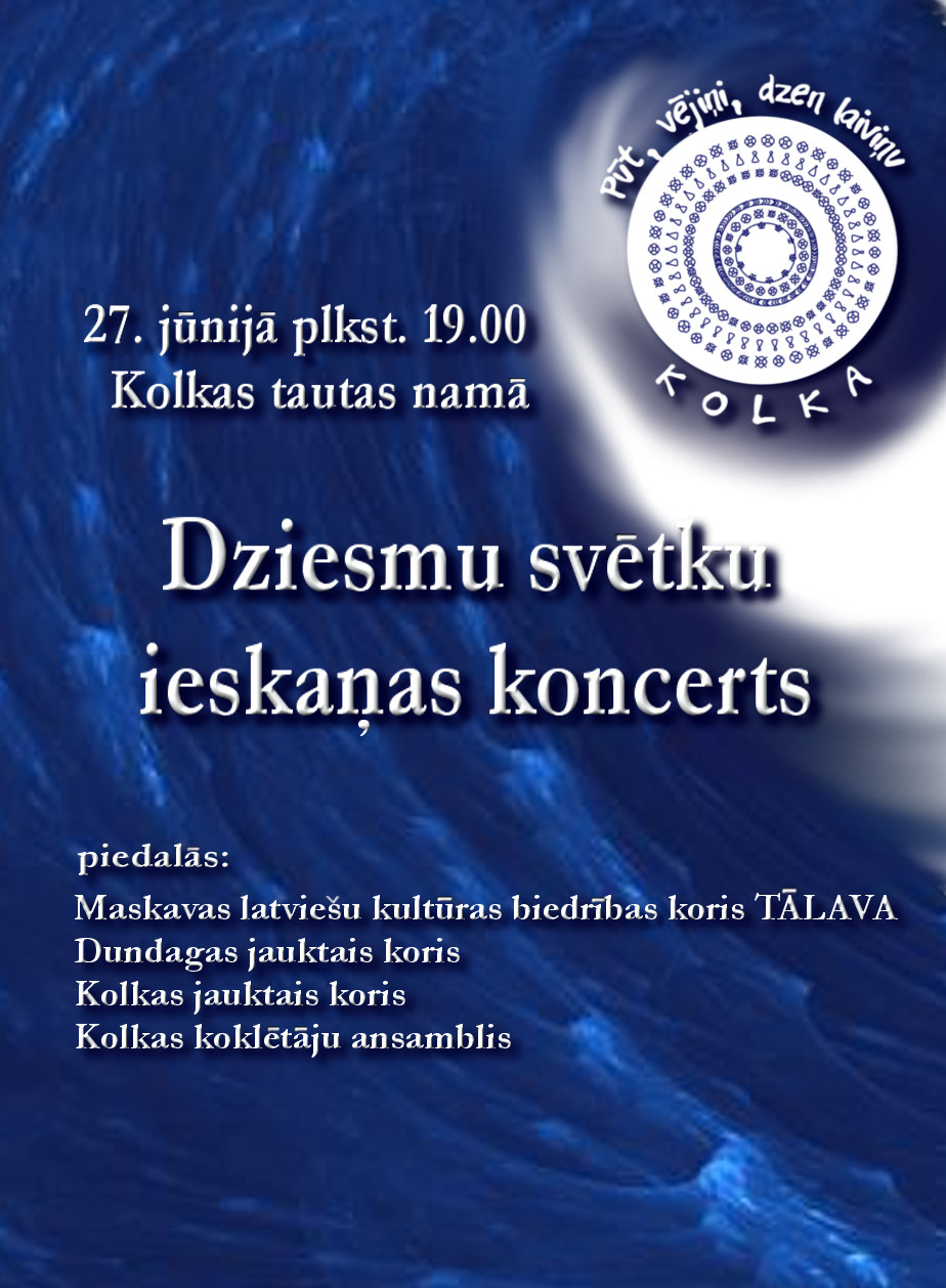 27. VI plkst. 19.00 Kolkas tautas namā notiks Dziesmu svētku ieskaņas koncerts. Piedalīsies Maskavas latviešu kultūras biedrības koris «Tālava», Dundagas jauktais koris, Kolkas jauktais koris un Kolkas tautas nama koklētāju ansamblis.
