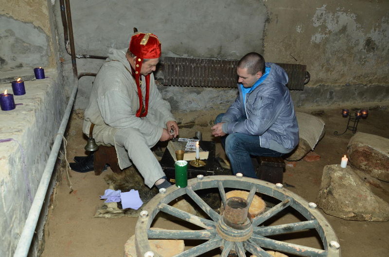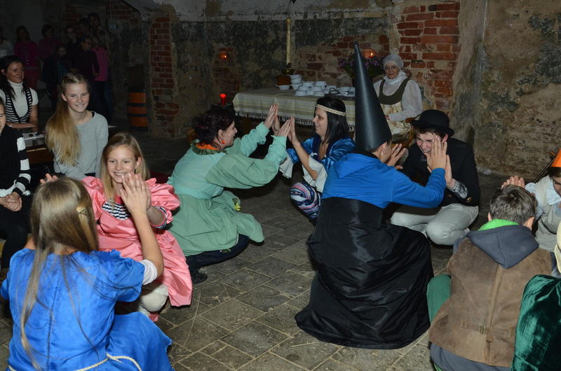 Pagrabstāvā mājvietu bija raduši kaut kad Pils dienās manīti viduslaicīgi tēli, kas piedāvājās zīlēt un liet laimes. Teju vislielāko piekrišanu baudīja Baiļu kambaris: kamēr pagarā rindā pacietīgi savu kārtu gaidīja baidīties gribētāji, tikmēr iekšpusē bija dzirdami neartikulēti šausmu kliedzieni! Saņēmos dūšu un pats arī iegāju… Neesmu tiesīgs atklāt pārbaudījumu būtību, jo Zaļās jumpravas atklātība lai ir par biedinošu paraugu visiem pils darbiniekiem, kā notiek, ja palaiž mēli. Vai nu pilij mūru trūkst… Tālāk telpu akustiku izmēģināja tautas mūzikas ansambļa «Tals’ trimiš’» vijolnieces, bet blakus, burbuļus mezdama, jau smaržoja zupa dižā katlā, patīkami kairinot nāsis un tālāk jau vēderu. Kā turpat vēstīja uzraksts, tad zupas bļodiņa bija apsolīta katram, kas gatavs par to samaksā ar … vienu deju.